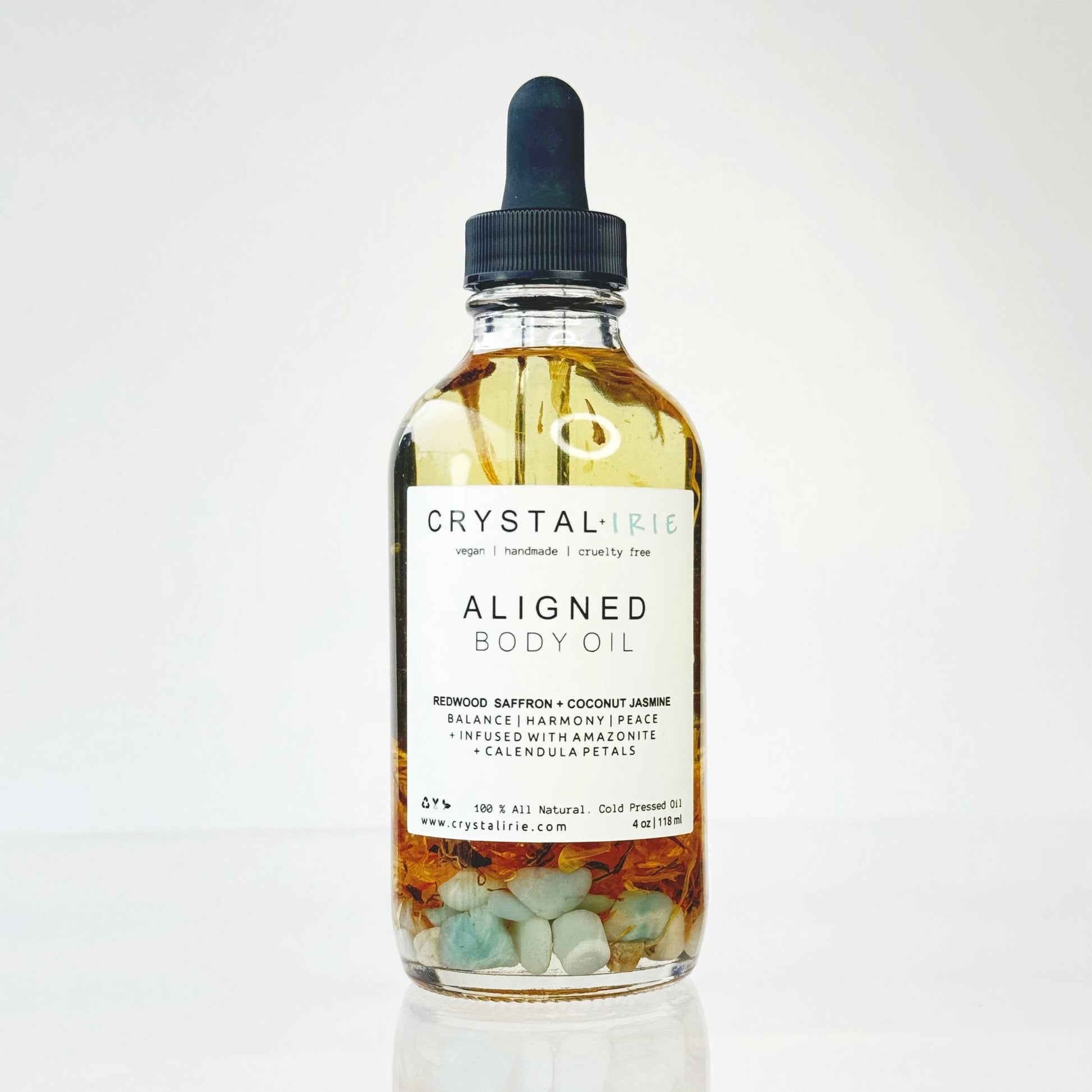 Aligned Body Oil is a lightweight full body oil Infused with Calendula and Amazonite. Made with Sunflower oil, sweet almond oil, and vitamin E oil. Scented with a warm blend of Redwood Saffron, coconut and Jasmine. This is a dry oil that absorbs into your skin quickly, leaving your skin smooth, hydrated, and silky. Can help with dry, itchy, irritated skin and eczema.