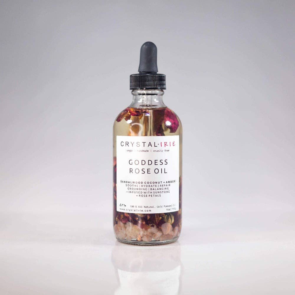 FOR ALL SKIN TYPES  This is a lightweight full body oil is Infused with Organic Rose Petals and Sunstone crystals. Made with Sunflower oil, sweet almond oil, and vitamin E oil. Scented with an intoxicating blend of Sandalwood, Eucalyptus, Coconut, Amber, and notes of Jasmine. This is a dry oil that absorbs into your skin quickly, leaving your skin smooth, hydrated and silky.
