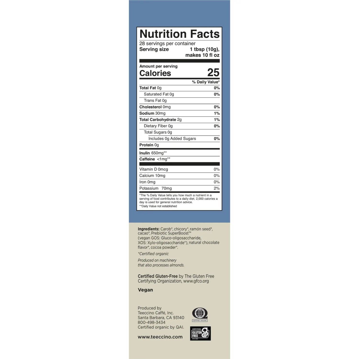 Golden roasted almonds with the essence of tropical macadamia nuts add delicious nuttiness to roasted chicory and carob complimented by slight sweetness from dates & figs.