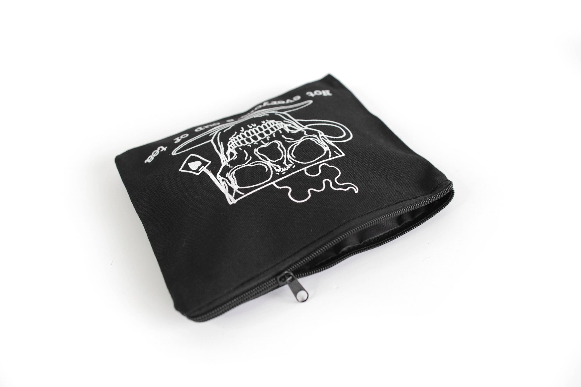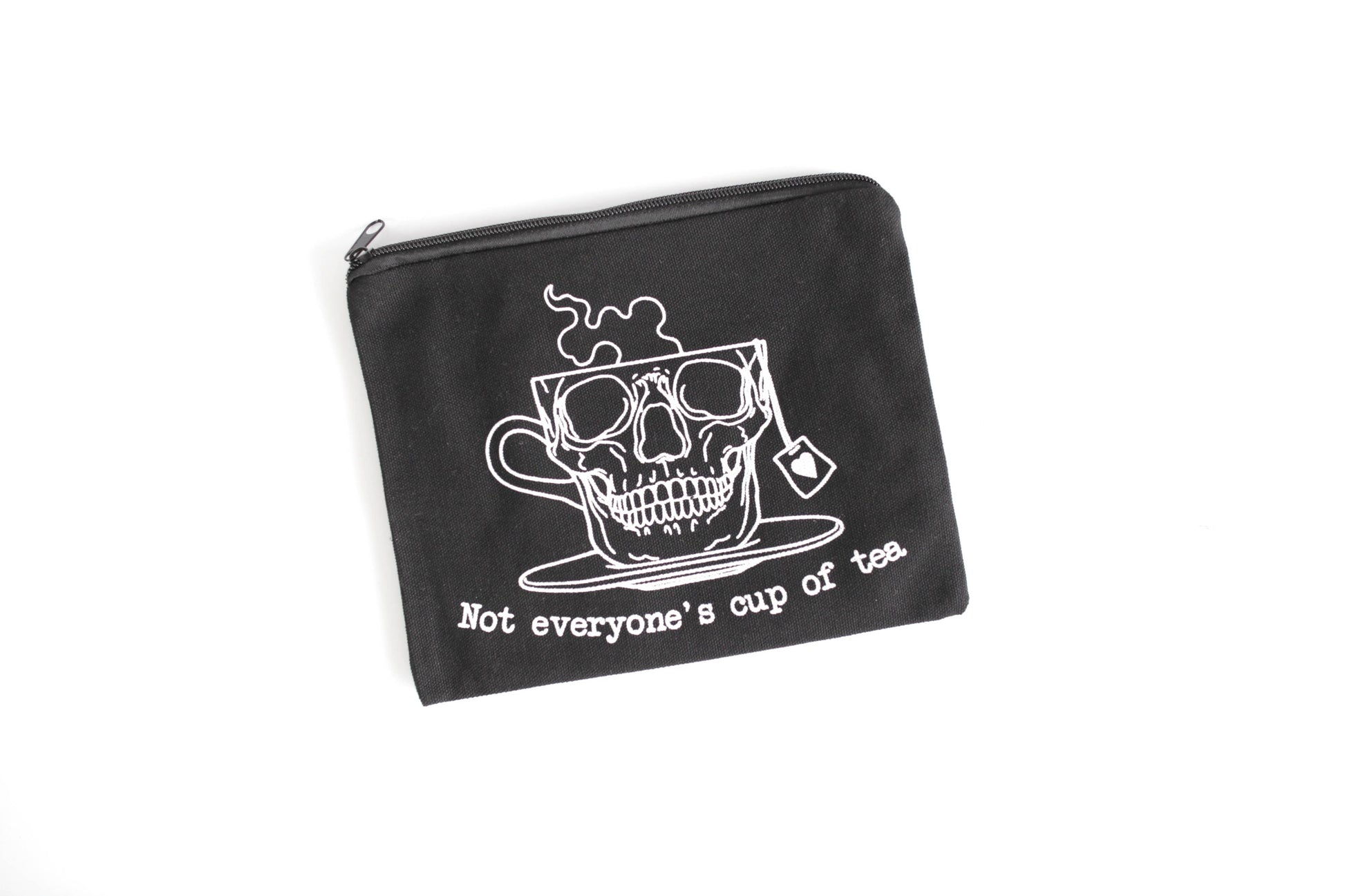 This versatile natural canvas zipper pouch is perfect for a variety of uses! Whether you need a wallet, makeup bag, toiletry bag, or even a pen/pencil holder, this little pouch has you covered. Featuring a fun design of a skull tea cup or coffee mug with the phrase "Not Everyone's Cup of Tea," it’s sure to add some quirky charm to your daily essentials.