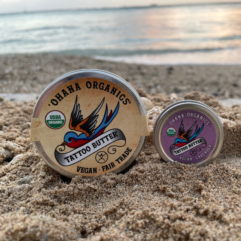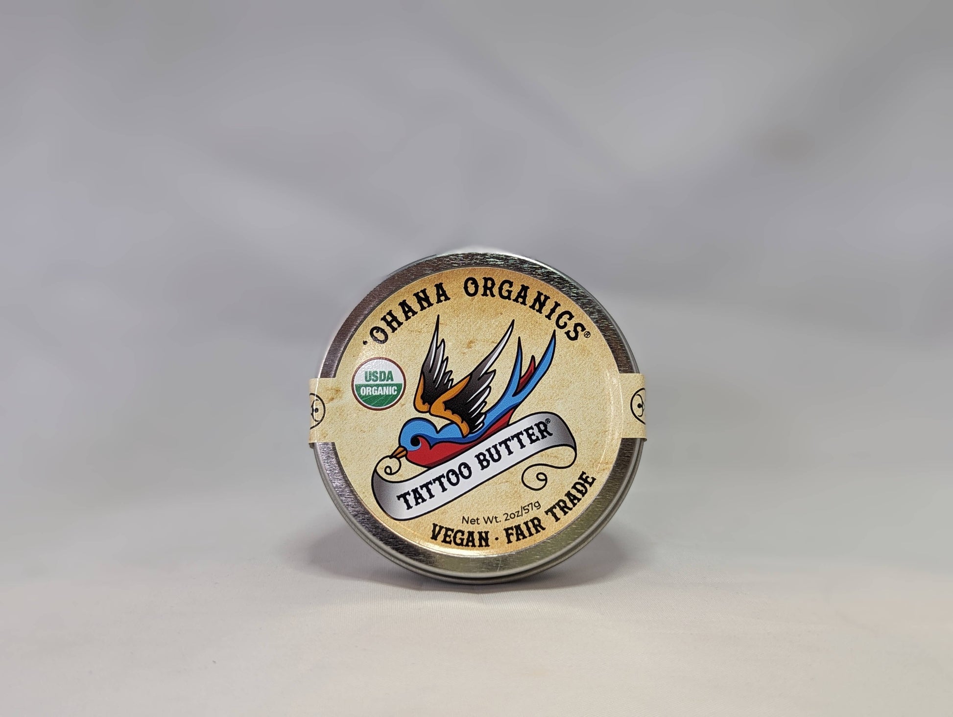 Our Certified Organic Tattoo Butter is handcrafted in small batches using only the finest vegan, plant-based, and certified organic ingredients. Made with Fair Trade Shea Butter and ‘Ohana’s organic herb blend infused in olive oil, this ultra-nourishing formula soothes, heals, and enhances your tattoo from day one.