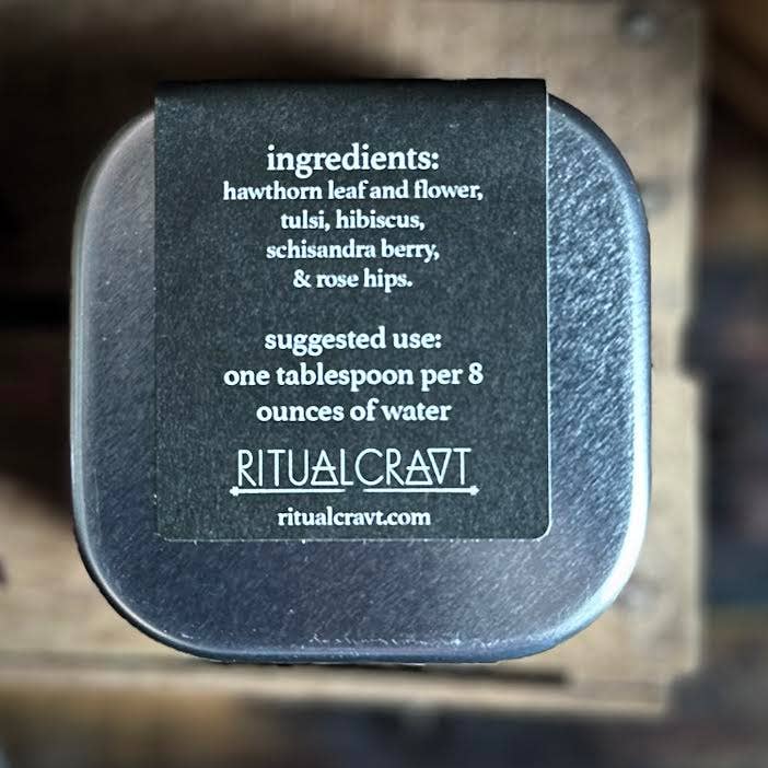 Ingredients: hawthorn leaf and flower, tulsi, hibiscus, schisandra berry, and rose hips. Once finished, the tin can be repurposed for other herbs or treasures. You will receive approximately 2.5 oz net wt.