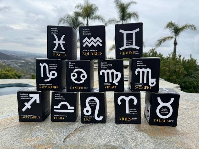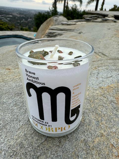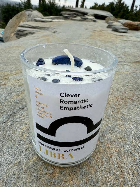 Glass Jar Zodiac Candles in all with individual scents and stones. 10oz. *The stones are loose on top of candle. When you burn the candle the stones melt into the wax.